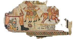 Esta sugerencia de gigantismo reaparece en el momento de su muerte. Sansón, ciego y prisionero, pide ser guiado hacia los dos pilares centrales que sostenían el templo de Dagón. El texto dice que “abrazó” o tanteó los dos pilares, uno con su mano derecha y otro con la izquierda. Para que una persona pudiera tocar simultáneamente las dos columnas principales de soporte de un templo enorme, su envergadura de brazos tendría que haber sido inmensa. De hecho, la evidencia arqueológica apoya esta antigua percepción: un mosaico del siglo V descubierto en Huqoq, en la Galilea, representa inconfundiblemente a Sansón como un gigante.